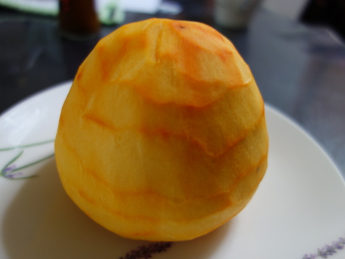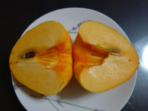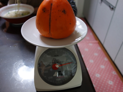 この大きな柿は富士山のようにそびえて見えるために富士柿と命名されたそうです。熊本産となっていましたが、元々は愛媛県が有名です。蜂屋柿が変異したものとされています。秤で重さを量ってみたら450グラムでした。スーパーにはまだこれより大きいものがありました。おそらく500グラムぐらいあったかもしれませんが、軟らかくなっていたので固めのものを選んできました。この富士柿は不完全渋柿ということで、アルコールで渋抜きをしてあるそうです。水溶性のタンニンを不溶化することで渋く感じなくなります。しかし、加熱処理などすると渋が戻ったりすることもあるそうです。化学的に考えれば、加熱することによって水溶性に戻れば渋く感じます。