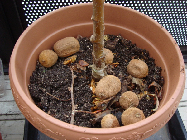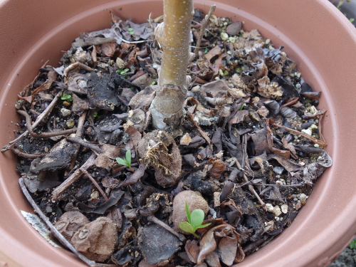 大きな柿からとった種もポリポットの土ごと根元に移しました。この柿の種は最初は銀色の小さなポリポットに土を入れて2ヶ月間蒔いていました。