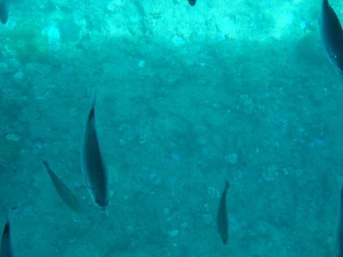 オヤビッチャとアカヒメジが多かったですが、カクレクマノミも見えました。個人的に気になったの(興味をひいた)は、尻尾に長いひものようなものが付いた黒っぽい魚です。その魚は今回の写真には写っていませんが…。そのひもは刃物のように切れるとガイドさんが言っていました。