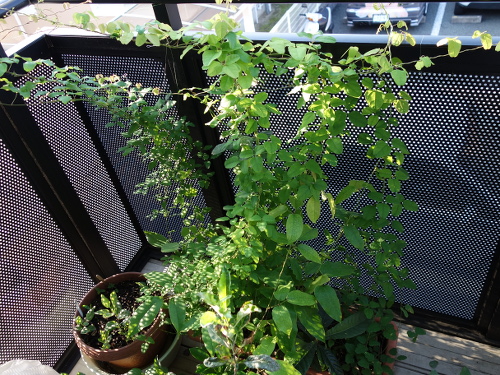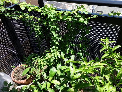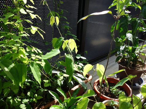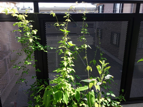 パッションフルーツのツルはそこそこ繁ってきました。ベランダに這わせると冬に枯れてしまいます。アケビとムベは耐寒性はあるので安心です。