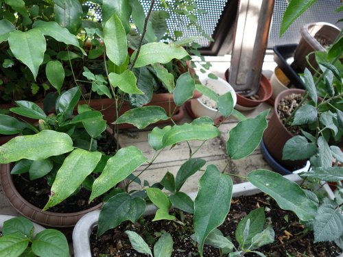 アケビとムベの種から発芽してもう2年近くなります。春には若葉がたくさん出てきますが、夏になると成長が止まります。この2年目の春にけっこう茂りました。夏が来る前にどれだけ生長するか見ています。アケビとムベの生長が止まったあとは、パッションフルーツやゴーヤなどが利用できるかもしれません。しかし、パッションフルーツやゴーヤは一年草扱いです。