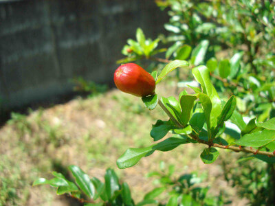 2013年7月21日、種子から発芽してまだ2年半しか経っていないのですが、果樹は予想以上に樹勢が強く、もうこんなに大きくなりました。とはいっても、まだまだ実は生らないだろうと決めつけていました。ところが、何か赤いものがあるのに気付きました。まだ小さいのですが、早くもザクロの蕾が3個ついていました。2年半しか経っていないのに、これには驚きました。何か縁起がよいような気がしてきました。