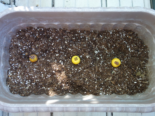 2016年に採れたイエローストロベリーグァバ3個を実生の栽培に用います。左からNo.1, No.2, No.3。