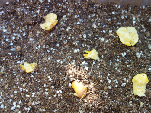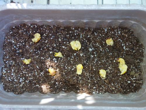 密集して発芽しています。果実を3つに裂いて置いたからです。