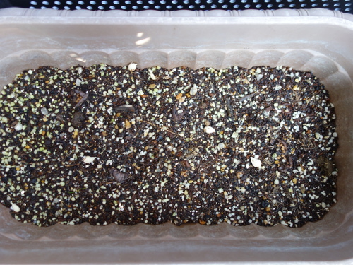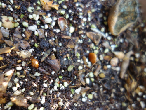 2016年9月下旬に蒔いたイエローストロベリーグァバの種が、10月10日現在、よく見ないとわからなくなりました。水を遣る時にあまり勢いが良過ぎると種が移動したり、埋まってしまうので注意していきます。芽は翌年(2017年)の春にけっこう出て来ると思います。しかし、殻(例えるなら帽子)が取れなくて枯れていく実生が少なからずあります。その殻はとても固いです。そういう困難を乗り越えた中で生き残った実生苗を鉢上げして育てていくことになります。それでもけっこうたくさん芽が出てきます。そして1年経った時点ではとても実が生るような状態ではありません。木といえないくらいです。仮に小さい実が生ったとしても耐えられないひょろひょろの苗です。それゆえ、花が咲くのは2年目の5月〜6月、果実が実るのは7月〜9月、果実を収穫できるのは9月〜10月です。よって、今のところ、イエローストロベリーグァバの種から実をゲットするには最速で丸2年かかります。それを短縮するには季節の周期を考えて1年しかありませんが、木の状況からして無理そうですね。でも、あきらめてはいません。まずは2年で収穫できることの再現性を確認するのが先です。そして目指すは1年で収穫することです。