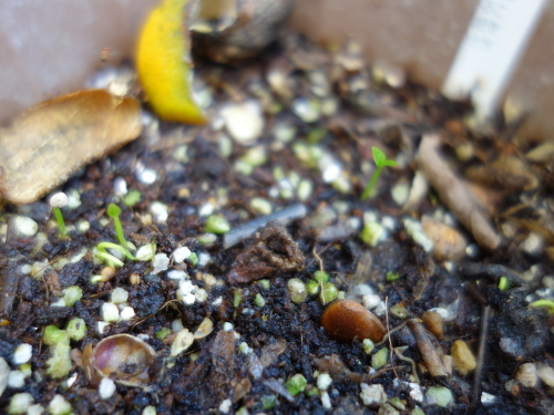 2016年10月27日、1ヶ月後に発芽しているのが確認できました。最も早いものは3週間ぐらいで発芽したと思われます。来年の春に発芽すると思っていたのですが、トロピカルフルーツは早いようですね。