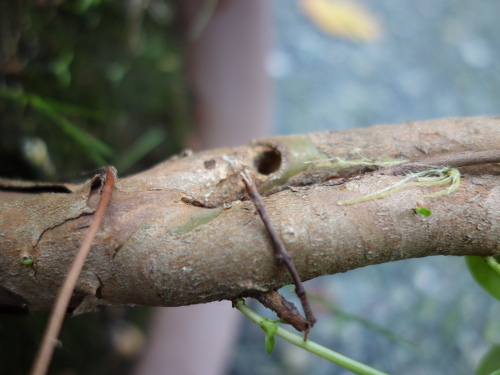 寒さに弱いので小屋の中に入れました。もしアパートのベランダで栽培していたら(そもそもベランダにカミキリムシがくる確率はかなり低いと思われますが)被害が広がる前に気づいたと思います。枯らしてしまったのは2014年以来、4年ぶり2本目です。カミキリムシは2018年6月ごろ地植えしたシークヮーサーの木の枝も食べていたので、油断も隙もありません。こまめにチェックが必要です。そして、もし見つけたら退治しなければ必ず被害が広がります。カミキリムシは捕まえようとするとわざと落ちて行きます。草の中で見逃さないように、確実に仕留める方法をとるべきです。私はシークヮーサーの木の下の地面に落ちたところで強く踏みつけました。
