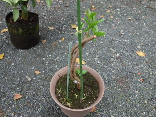 枯れてから4ヶ月後の2018年12月2日、芽が出て生長していました。根がまだ生きていたようです。もう捨てようかと思ったこともありましたが、すぐに捨ててしまわずに結果的によかったです。2019年は枯れないように生長することができれば、2020年には実が生ることが期待できます。最短で2年ですから。