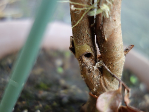 トップページ > フルーツを食べて種から育てる > カミキリムシに食害されて枯死したグァバの実生