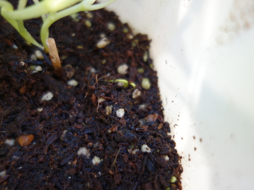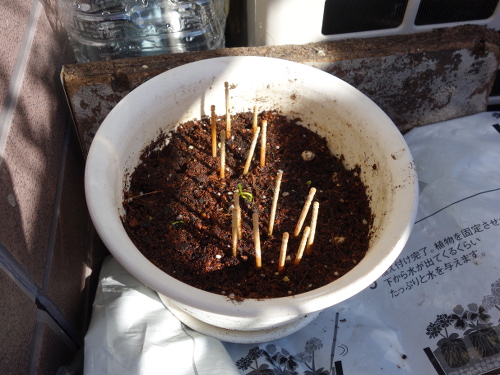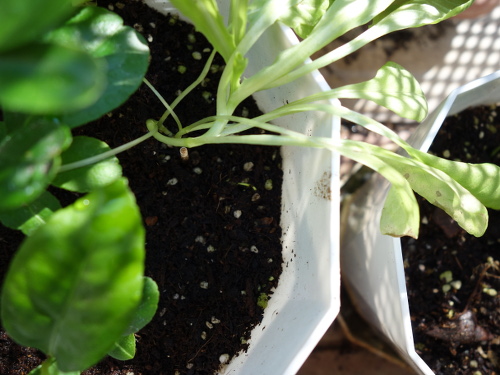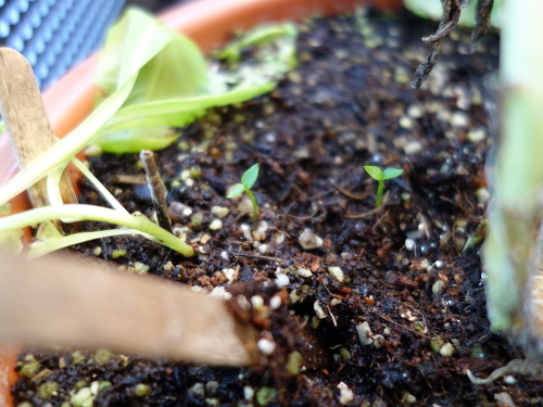 新規に移植した2本はスイカとサラダ菜を植えた鉢のものです。まだ地中から頭をもたげたばかりの曲がった芽が2本あったので、それらを1枚前の写真の鉢に移植しました。よって、この写真の2本は移植していないよく育っている2本です。移植しなくて済むならば、その方が枯らす確率は低いからです。