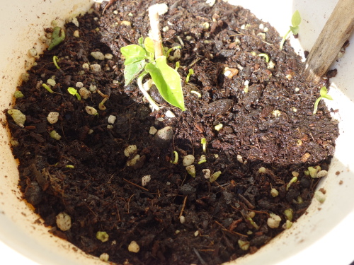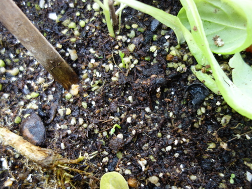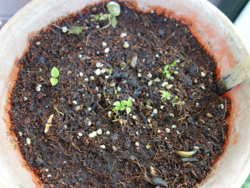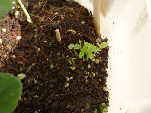 サラダ菜の根元にあった種から続々と発芽しました。もう少し大きくなったら選んで別の鉢に植え付ける予定。サラダ菜は食べたので、もうありません。