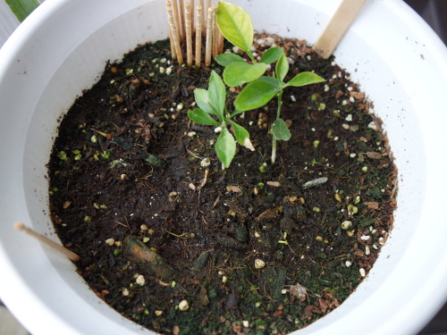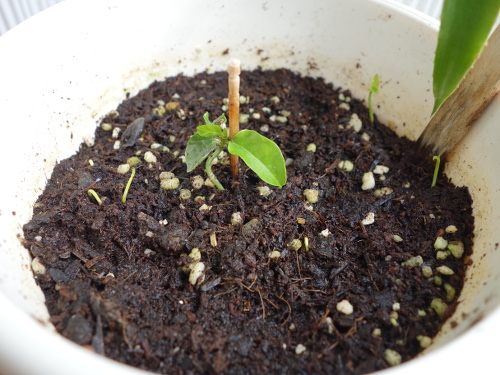 金柑の実生苗を植えている鉢でイエローストロベリーグァバの種が2本発芽しているのが確認できました。
