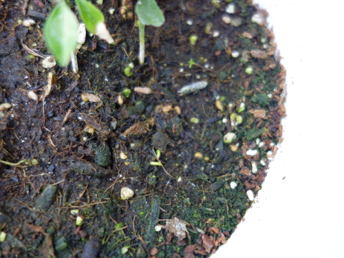 同日、レモンの鉢に置いたイエローストロベリーグァバは多数の発芽が確認できました。その後、レモンの実生苗は枯れたので、パッションフルーツの実生苗を植えました。この写真ではパッションフルーツの実生苗が中央に植えてあります。