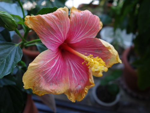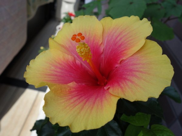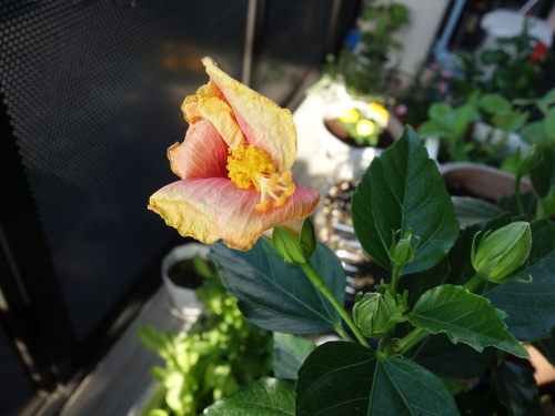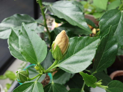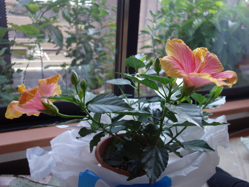 買ってきたハイビスカス サンセット。すでに2輪咲いています。間もなく咲きそうなつぼみが1個あります。