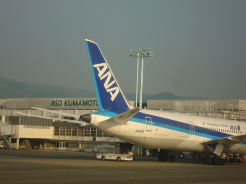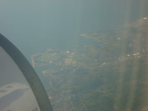 雨のままブセナテラス宿泊の3日目最終日を迎え、後ろ髪を引かれながら熊本空港行きの帰りの飛行機に乗ることになりました。帰りの座席は左側の端っこ8Aでした。ちょうどエンジンがある場所で、眺めは今ひとつでした。ちなみに行きの時の座席は8Fで、右側の端っこだったので、左下に見える桜島や奄美大島は見えませんでした。晴れていたので8Aだったら桜島は何とか見えたことでしょう。