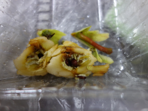 2016年4月20日現在、発芽が確認できました。これで、発芽していないのはシナノスイートだけになりました。これまでいろいろなりんごの種を蒔きましたが、全体的にりんごの発芽率はかなり高いといえます。ただ、蒔いた種の個数からみた発芽率は品種によるようです。私の感覚ではふじ系(交配したものでもふじが入っているもの)は高いように思います。