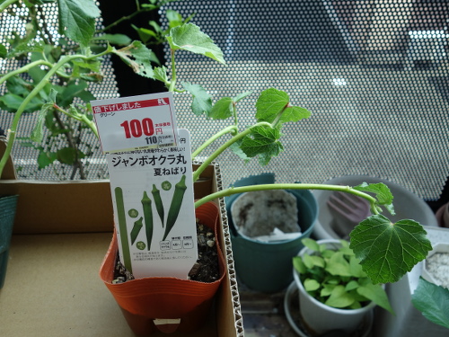 ジャンボオクラの苗が売れ残っていて、かなり茎が曲がって、葉っぱも傷んでいますが、半額で売っていたのでダメ元で育ててみようと思いました。まずは梅雨の時期を乗り越えられるかです。