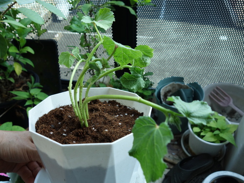 ナフコからジャンボオクラ丸(夏ねばり)というジャンボオクラのポリポット苗を半額で1個買ってきました。苗が5本ですが、そのうち成長のいまひとつの苗を間引きします。