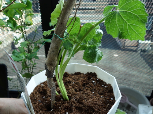 吊りラベル用のビニール線で茎を束ねて、枯れてしまったポンカンの接木苗を逆さに土に刺してジャンボオクラの茎をゆるく結びつけました。茎を矯正しようという試みです。横から撮影しました。