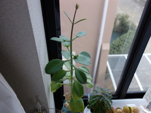 茎が伸びて、葉っぱの色が戻ってきました。先端に蕾ができていました。
