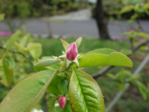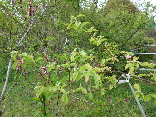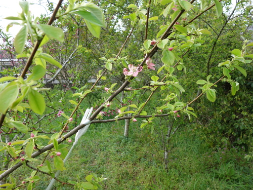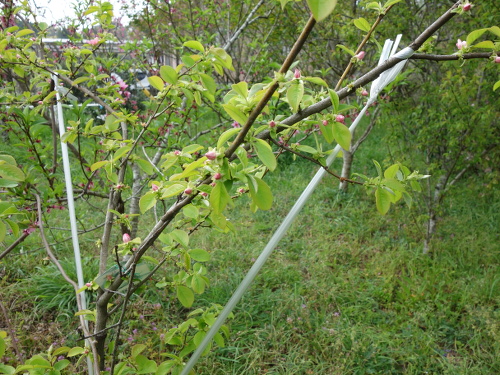紐で引っ張って曲げた主要な枝3本のうちの2本目も花が咲いています。