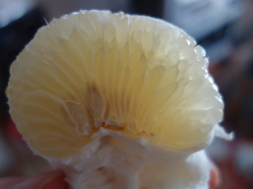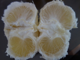 じょうのうを裏返しにすると、砂じょうはこんな感じです先端に種がついています。味はハッサク(八朔)に似ていますが、酸味が少なく食べやすかったです。
