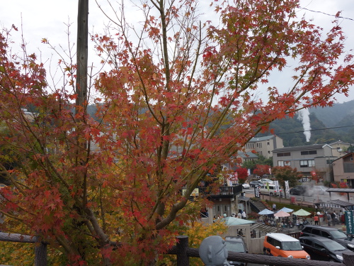 10:28撮影。旅行人山荘の駐車場から見下ろしたところの広場にあった紅葉。ここには写真を撮っている私の後ろに足湯もあります。銀杏はまだ黄色になっていませんでした。