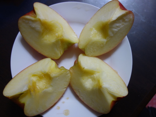 2016年1月21日(金)の夕方に近所のスーパーに行きました。そこで初めて見るりんごがありました。「こうとく」と表示してありました。漢字では「高徳」と書くようです。何でも最も密の入る(80%にもなる)といわれる「こみつ」という品種の(ざっくり言えば)親にあたるような感じの位置づけの品種です。糖度は14度で高いです。果実の大きさは小ぶりで、見た目もそんなに良くないのですが、食べてみることにします。