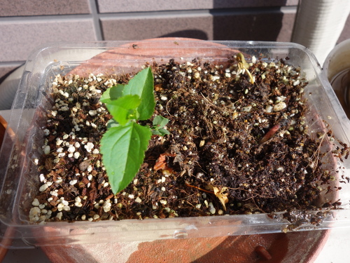 残りの1本は白いプランターの金星りんごの実生苗の近くに植え替えました。(これは5月下旬に処分しました)