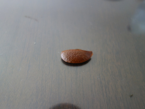 食べてみたところ、ゴマが入っていないところは若干渋かったです。種は1個しか入っていませんでした。不完全甘柿ですからこんなものでしょう。この種を植えて芽が出るかみていきます。もちろん、実生では親と同じ実は生らないと承知の上です。発芽するかどうかやってみたいのと、発芽したらそのまま育ててどんな実ができるかを知りたいというのが目的です。