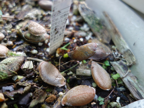 反対側から撮影。まわりにあるのは富有柿の種。発芽しているのは黒柿の種であることが種の大きさと形からわかります。当たり前ですが、埋めずに置いているだけではほとんど発芽しません。