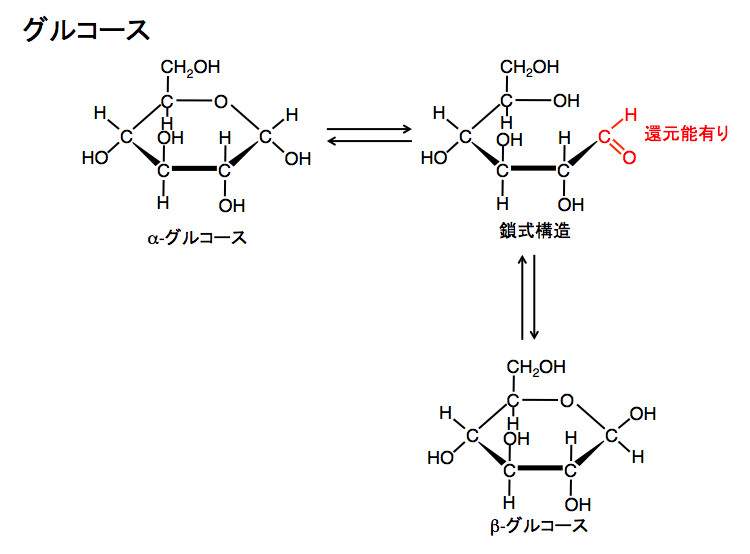 デンプンもセルロースもグルコースが繋がってできたポリマーですが、ヒトはデンプンは消化できてもセルロースは消化できません。これは、私達はデンプンを消化できる酵素を持っていますが、セルロースを消化する酵素は持っていないからです。デンプンもセルロースもグルコースが繋がってできたものなのに、どうして片方は消化できて、もう片方は消化できないのでしょうか(とは言っても消化できないからこそ、食物繊維として腸内を掃除してくれるわけですから、悪いことではありません!)。それは、繋がり方が違うだけです。デンプンはα-グルコースがH2Oがとれる形で繋がっています(α-1,4結合といいます)。一方、セルロースはβ-グルコースがH2Oがとれる形で繋がっています(β-1,4結合といいます)。たったこれだけの違いなのですが、酵素はたったそれだけを正確に認識して、デンプンの方だけを分解してマルトース(麦芽糖、α-グルコースとβ-グルコースが1個と1個繋がったもの)に分解します。だから、ご飯を口の中に含んでいると、アミラーゼにより加水分解されてマルトースになり、甘く感じます。なぜデンプンを消化する酵素でセルロースを消化できないかというと、酵素は基質特異性といって、酵素(触媒であるタンパク質)と基質(酵素によって反応を受ける分子)が鍵と鍵穴の関係が成り立つもの同士しか反応しないようになっているからです。ですから、極端に言えば、例えば10000種類(10000個ではありません)の基質があったら10000種類(10000個ではありません)の酵素が必要になるわけです。