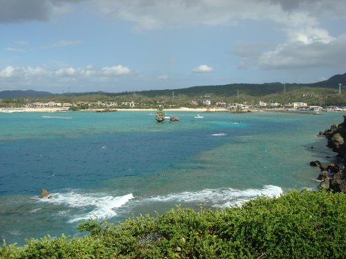 15:19撮影。この写真の中央付近は万座ビーチです。行ってみると人気が高いのがわかります。