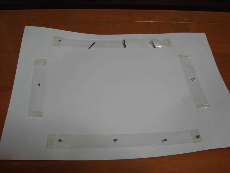 MacBook Pro本体の裏の蓋を小さなプラスドライバーで慎重に外しました。ネジは全部で10本、そのうち長いのが3本です。なくしたら大変なので、セロハンテープをA4用紙に粘着面を表にして貼り付けて、はずしたネジを本体のネジの場所と同じ場所に張り付けました。