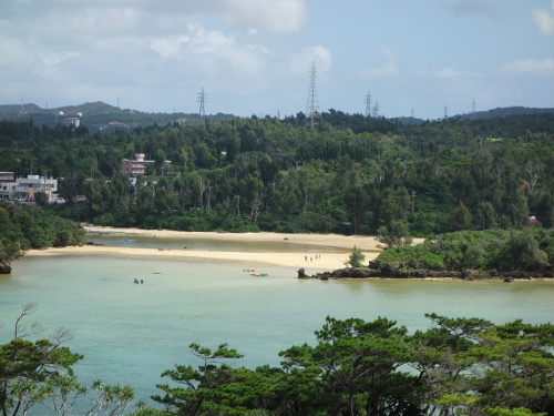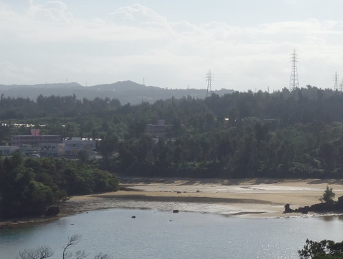12:54撮影。干潮のビーチの向こうになかむらそばが見えます。