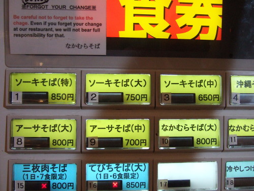 19:04撮影。英語で「おつりを忘れないように。もし忘れてもうちの店は責任は一切取りません!」と書いてあります。米軍の人が来たり、外国人観光客が来たりするのでしょう。
