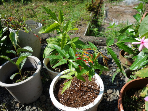 オクラの根元に置きました。葉っぱはまるで日本のセンダンの木のようです。