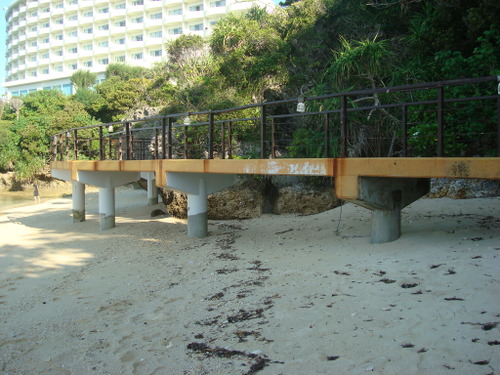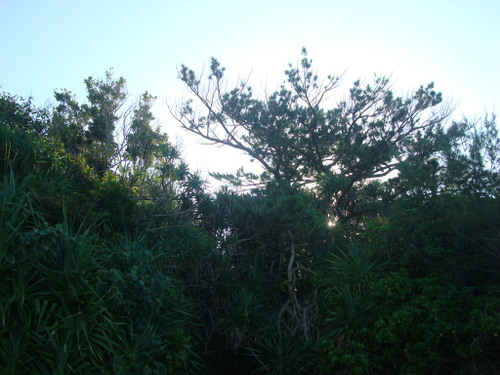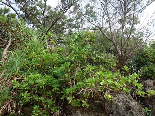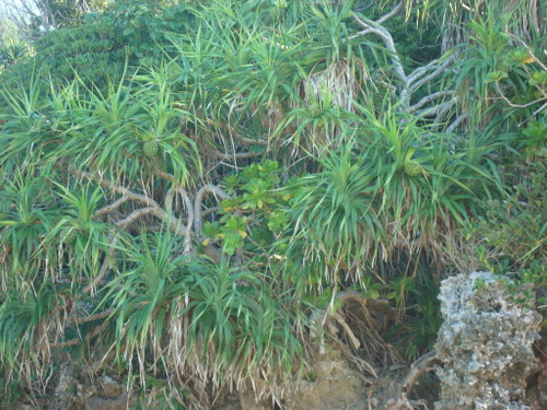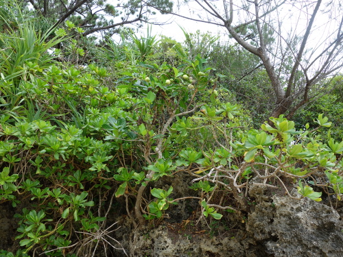 万座ビーチに砂浜を通って歩いていくのはちょっとした探検気分になります。ほぼビーチに着いた手前の薮に珍しい実が生った木がありました。アダンの実とは異なる、奇妙な表面をした実です。写真を撮っておいてあとで調べてみたらノニの実でした。ノニはヤエヤマアオキといいます。ノニは果実のみならず葉も食用にでき、医薬品にもなるようです。ノニの樹皮や根は染色に利用されています。実や葉は健康食品としても売られています。