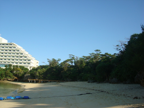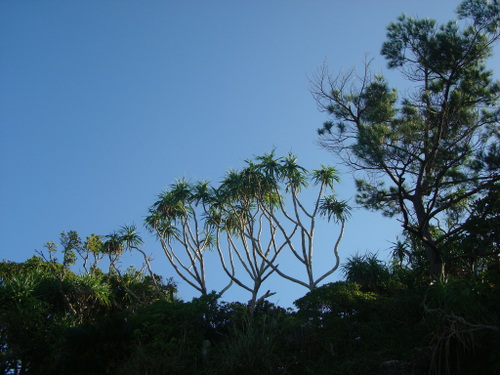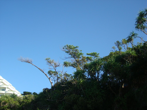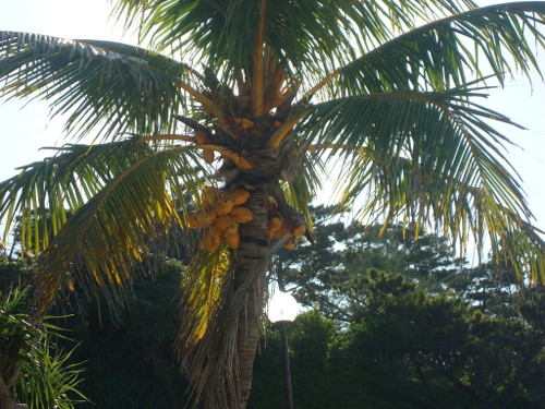 8:34撮影。万座ビーチのプールの近くに生えていたココヤシの木