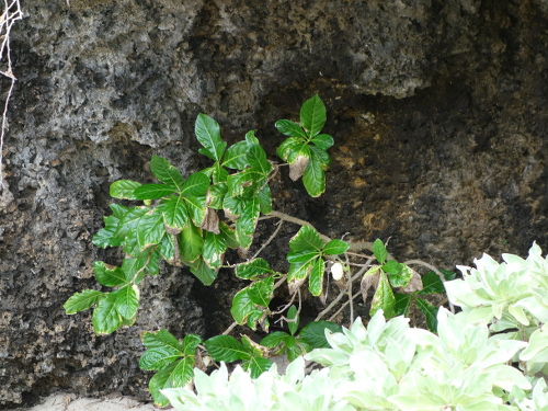 15:11撮影。万座ビーチに行く途中の洞窟の近くに生えていたノニの木。実が生っています。