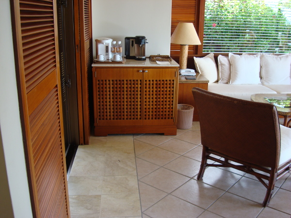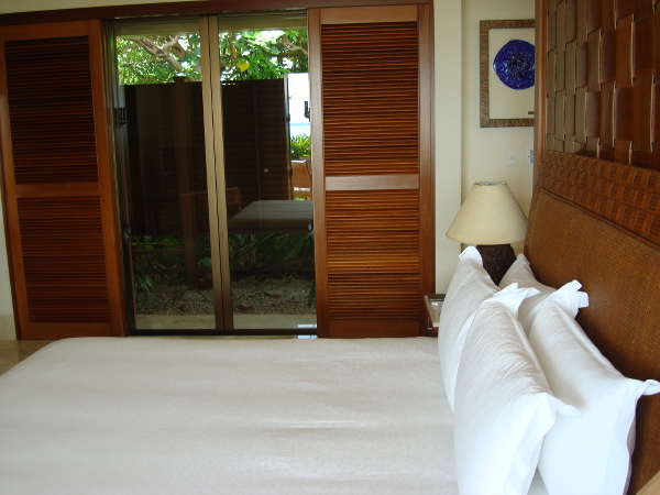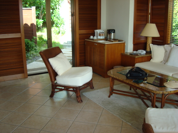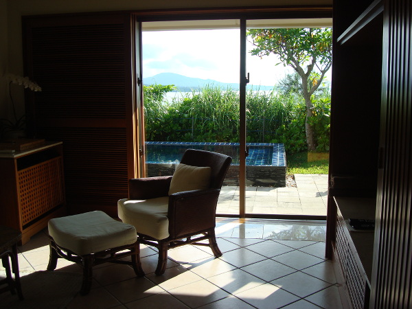 ザ・ブセナテラスのクラブ・コテージのラグジュリアス・スイートにはプライベートプール、ビーチチェアー、ビーチパラソルなどがありました。2人では持て余すぐらいのグレードで、私達は却って落ち着きませんでした。根っからの庶民なのでしょう。本館のロビーの喧騒が恋しくなり、プールやビーチへすぐ行ける地理的条件が本館の方がいいと思いました。それと部屋の高さ(priceではなくheightの方)です。本館の方が高いところから見下ろしている風景です。また、クラブ・コテージの部屋から見た海は若干陸の方に向かっています。つまり、内海の方(かりゆしビーチの方)に少し向いています。そういうわけで、ラグジュリアス・スイートに1泊して、次の日にはデラックスナチュラルオーシャンビューに戻してもらうことにしました。元々安い方のプランなので、クラブ・コテージから移るなんて、なぜそんなもったいないことをするのかと思う方もおられるでしょうが、これは人それぞれで、個人の好みによると思います。