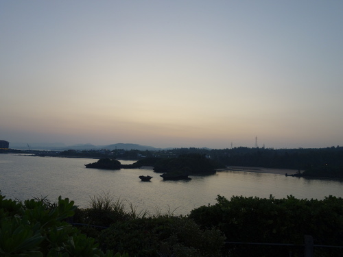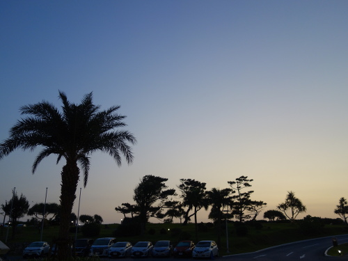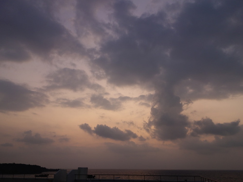 ANA万座ビーチホテルの玄関前の広場の端から見た夜明け前の東の方の海。6:13撮影。