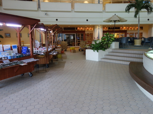 ANA万座ビーチホテルの朝市。まだ朝が早いので、人はいません。朝食後にはいます。6:55撮影。