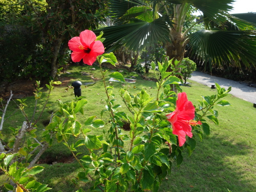 ビーチから帰って来て水道で足を洗うところに咲いているきれいなハイビスカス。12:00撮影。