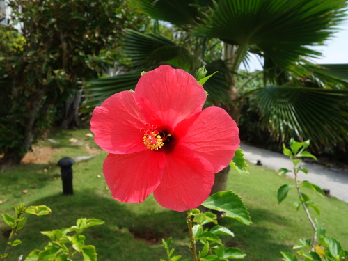 プールサイドの水道のところに咲いていたハイビスカス。9:10撮影。