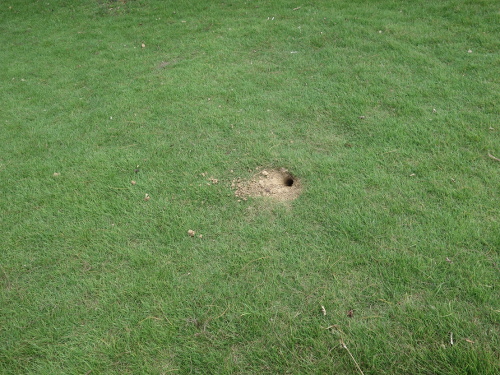 芝生に空いた穴。カニか何かいるのでしょう。12:02撮影。