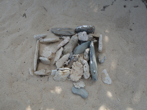 御菓子御殿恩納店の裏の浜辺に並べられた石。13:37撮影。