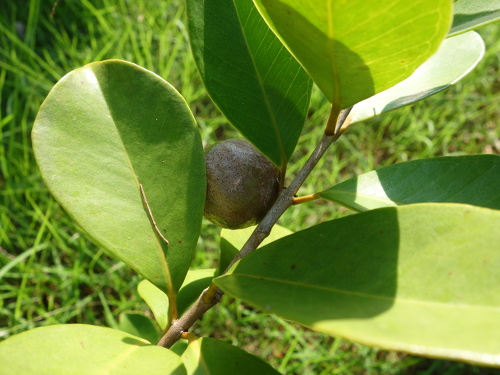 万座ビーチの上の道路の脇の万座ビーチに下りる道の脇に植えてあったストロベリーグァバ。15:40撮影。たまに太陽光が射しました。青空も見えました。でも、雲に遮られることが多かったです。