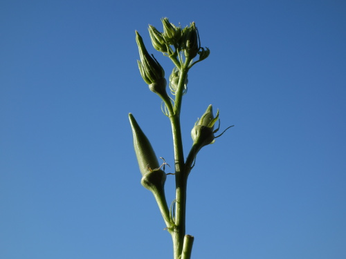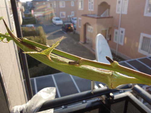 オクラの栽培を始めて、最初は3本あったのが苗立ち枯れ病で1本だけ残りました。その生育記録の3ページ目です。途中で台風15号でダメージを受けながら復活し、今では全長2.4メートル近くなり、ベランダの庇に届きました。幹に葉っぱは2枚しか付いていません。そろそろ終了です。その前に種を取りたいと思い、1本だけ大きく育てています。