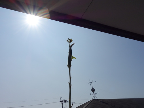 トップページ > 循環型プランター栽培 > 別バージョントップ > オクラの木が庇に届きました